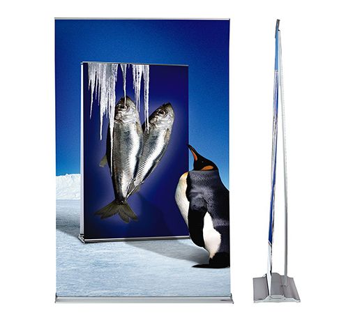 Este display no solo cuenta con el cartel en sí, sino que además se apoya en su propio soporte, de esta manera lo único que transportamos es un cilindro, en cuyo interior está tanto la estructura como el propio cartel.